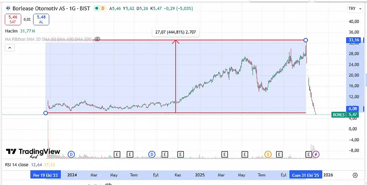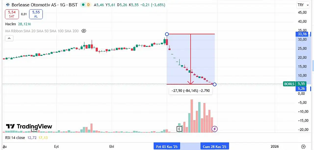 Borlease Otomotiv’in borsada işlem gören payları da bu hisselerin başında geliyor. Zira, Kasım ayının ilk günlerinde 30 TL’nin üzerinde işlem gören BORLS payları, son zamanlardaki sert düşüşlerle birlikte adeta dibe vurmuş durumda. 3 Kasım 2025 tarihinde şimdiye kadarki tarihi zirve fiyatını gören BORLS payları, 33,16 TL’ye kadar yükselmişti. O tarihin ardından sert düşüşe geçen BORLS hisseleri, günümüze kadar neredeyse aralıksız düşmeye devam etti.