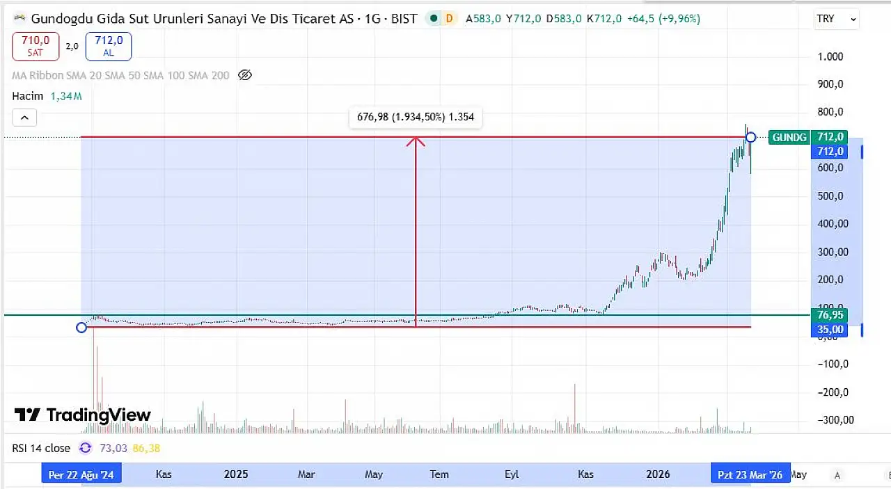 Son zamanlarda sert yükselişlere sahne olan GUNDG tahtası, 23 Mart 2026 tarihli seansa düşüşle başlayarak taban fiyata kadar düştü. Önceki seansı 647,50 TL’den kapatan GUNDG hisseleri, ardından 583 TL’ye kadar gerilese de gelen güçlü alım sinyalleri; yatırımcıyı hisse tahtasına çekti. GUNDG hisseleri yüklü alımlarla birlikte 712 TL olan tavan fiyata yükseldi.