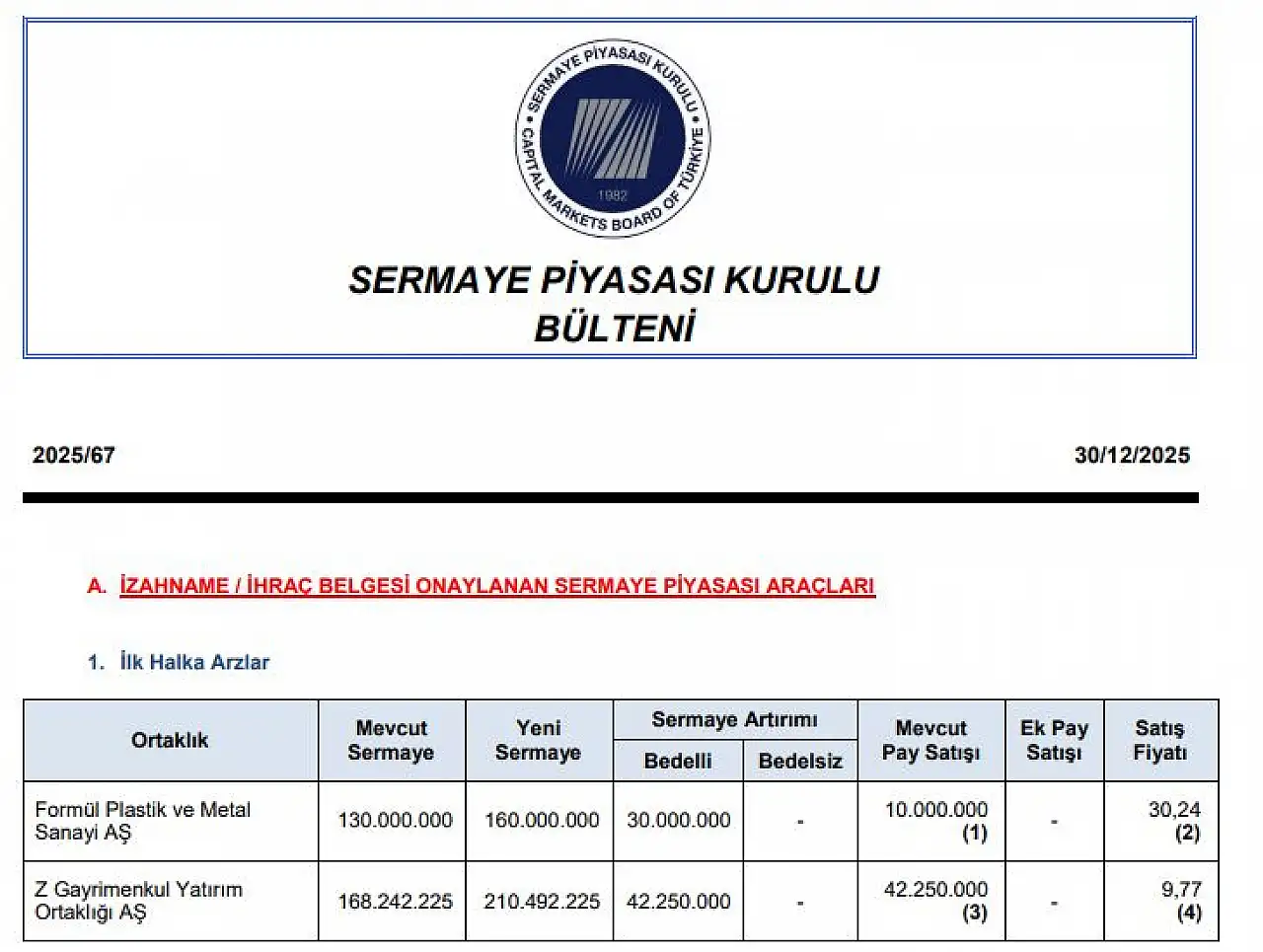 Sermaye Piyasası Kurulu (SPK), 30 Aralık 2025 tarihli haftalık bültende, Z Gayrimenkul Yatırım Ortaklığı A.Ş. (ZGYO) ile Formül Plastik ve Metal Sanayi A.Ş. şirketlerinin halka arzına onay verdi.